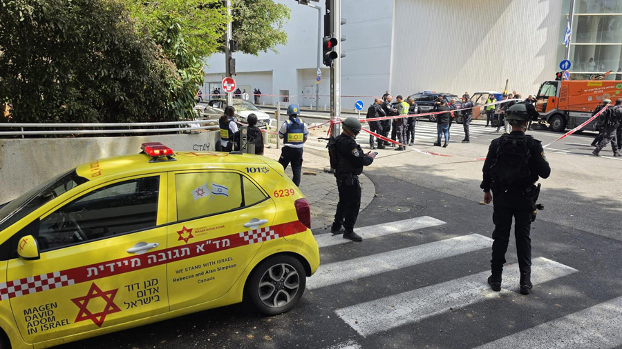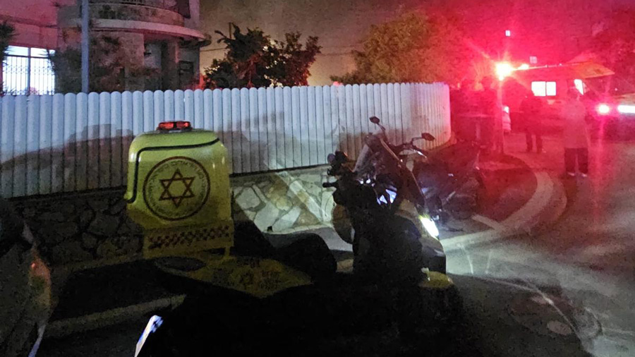 Les équipes de secouristes et de paramédics du Magen David Adom prodiguent des soins médicaux et évacuent vers l’hôpital Ichilov un homme d’environ 60 ans, blessé modérément par des éclats de verre à la tête.